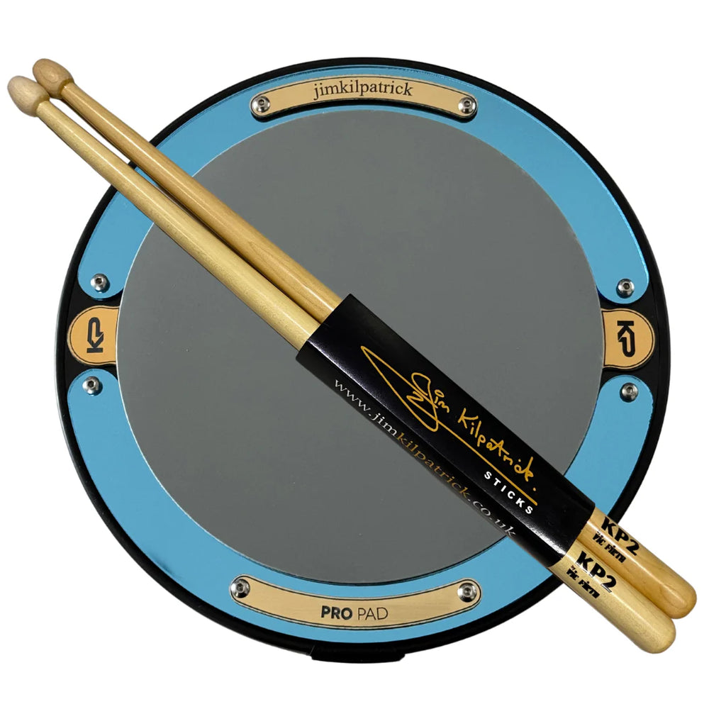 PERSONALISED ENGRAVED Jim Kilpatrick Blue Mirror PRO PAD & KP Drumsticks Bundle