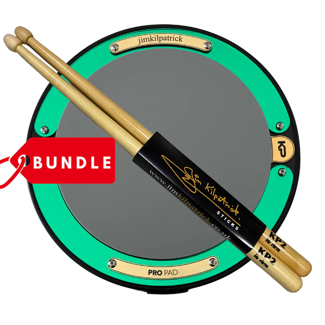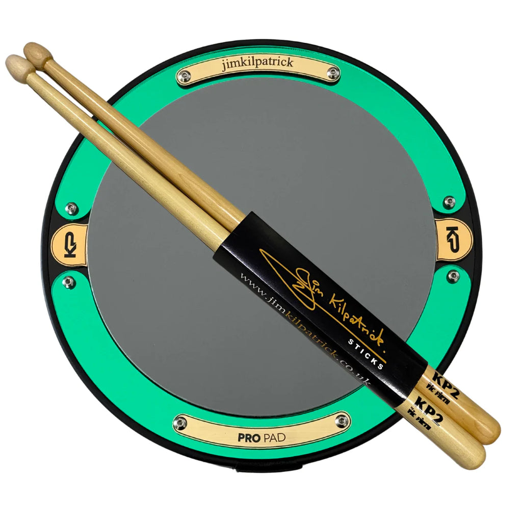 PERSONALISED ENGRAVED Jim Kilpatrick Green Mirror PRO PAD & KP Drumsticks Bundle