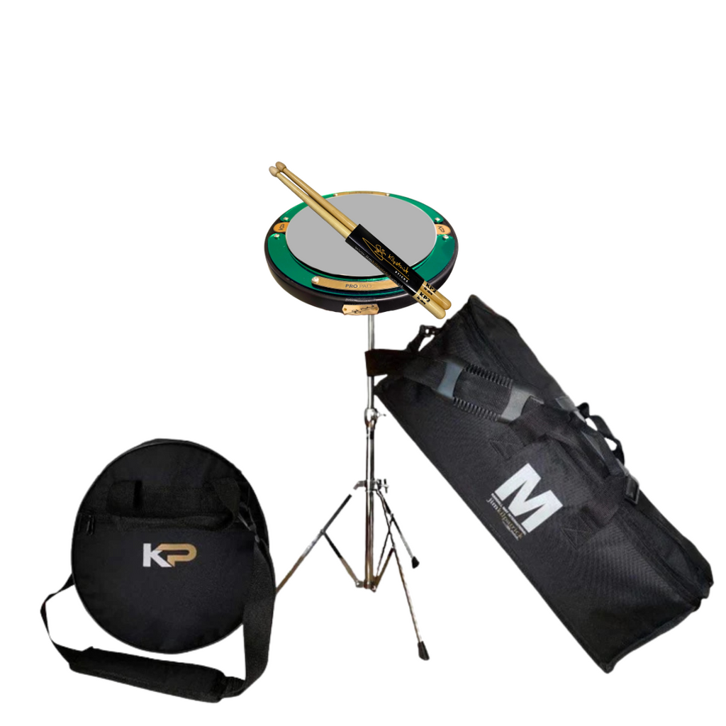 ENGRAVED Mirrored Green PRO PAD Bundle (Pro Pad / Pad Bag / Lightweight Practice Pad Stand / Practice Stand Bag / Drumsticks)